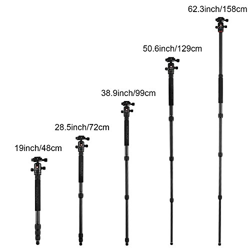 - Monopod mode: this portable tripod can be converted into a 60.3″ monopod by screwing together the center column and removeable tripod leg, you can take it anywhere.