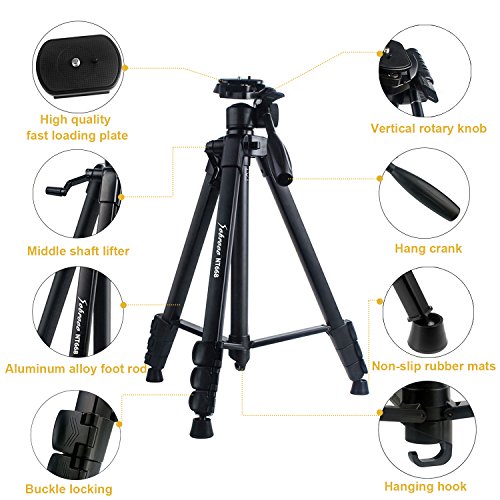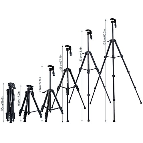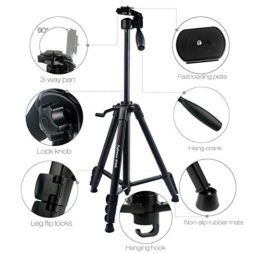 - 【Adjustable Functionality】Tripod body contains 4 section legs, 3 locks and center column for support. From 18inch to maximum height of 55inch.