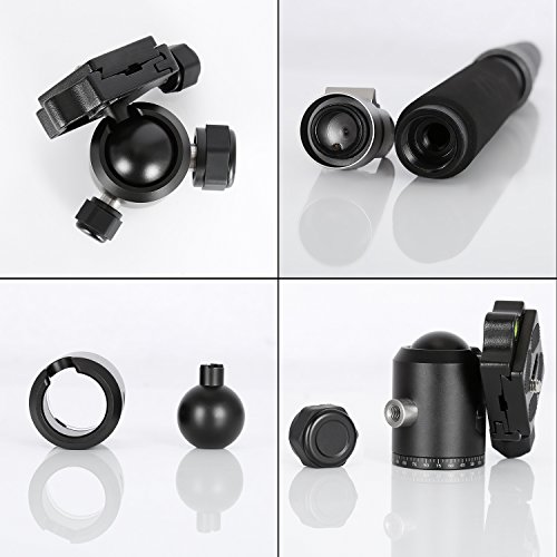 • ENHANCED BALL HEAD: Our professional tripod comes with an enhanced ball head, which can rotate 360-degree horizontal swivel and 90-degree vertical platform with our 3-way head, and allows you to take photos at any angle. Also, it includes a quick release plate, strong locking knobs, a 33mm ball and 2 bubble level indicators, these integrations make it perfect to attach and detach your cameras in seconds and prevent your cameras from accident damages