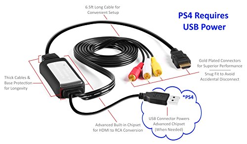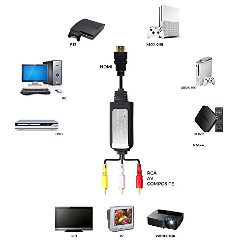 - ♠ WORKS WITH ALL DEVICES – Connect HDMI plug into any device with HDMI output such as PlayStation 4/XBOX/PS4/PS3/PC /TV Box/Projector & more – Then connect the RCA end into any display with RCA inputs such as Monitor/TV/HDTV/TV Box/Projector and more – *Some devices will require the chipset to be powered by the attached USB cable