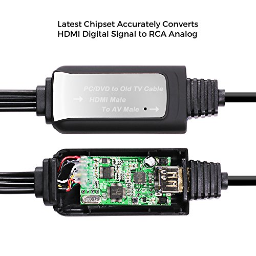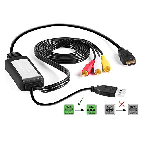 - ♠ BUILT IN CONVERTER – Play new HDMI devices on older TVs/Displays – Unlike other HDMI to RCA cables this one features a built in converter – Saves you money by eliminating the need for extra components – RCA, AV and composite are the same
