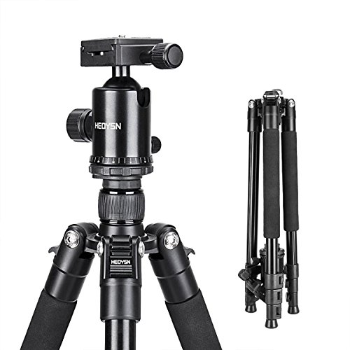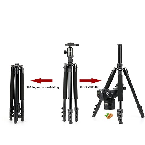 - Compact & Lightweight. Made of high quality aluminum alloy tube and engineering-plastic. Weighs: 2.98lbs / 1.35kg. Load: 17.6lbs / 8kg. And the aluminum tripod with compact size of 18 inches after being inverted and folded back 180 degrees. Easy to store in the included carry bag for storage and carry