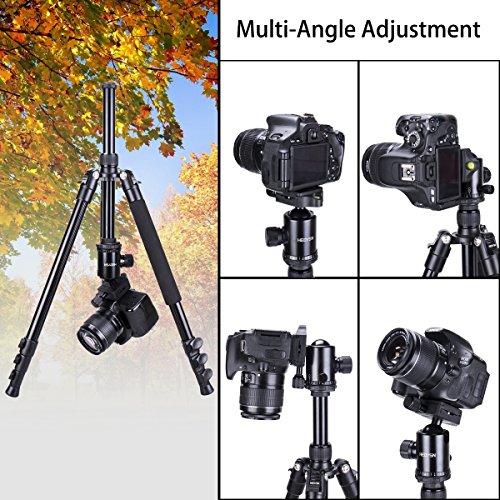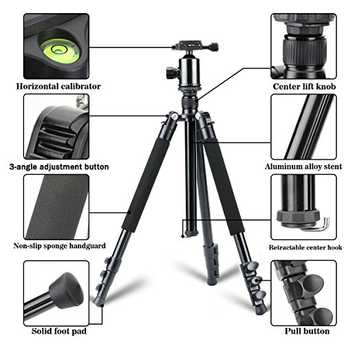 - Adjustable Design. The camera tripod has 4 sections legs with quick release flip locks, which allows you to extend the height from 18″ to 65″ soon. Its self-adjusting legs are designed to get a steady platform