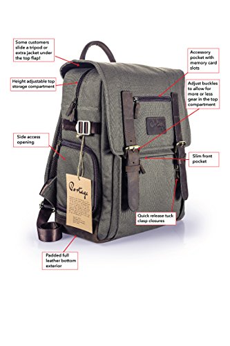 Premium thick cut top-grain leather and waxed canvas backpack is designed to hold a host of DSLR camera gear, lenses, and up to a 15″ laptop, along with a separate space at the top for personal items. Side pockets and straps can be used to hold a tripod, or other items. Portage uses the finest quality hardware, materials, and components, with abundant padding throughout to help protect your gear when you’re on the go. If you’re looking for a camera bag that doesn’t scream “hey I’m a camera bag”, this is your bag. It’s designed for the professional or amateur photographer who wants to look good while they shoot. Waxed canvas is a water resistant material that has been used by mariners as early as the 1600’s. Portage Supply Co. is a small business that sources premium quality goods at an affordable price. Compared to similar quality bags, Portage delivers an excellent value! QUALITY GUARANTEE: We stand behind our products. If you experience any issues with quality of workmanship, please do not hesitate to contact us through your Amazon account and we will resolve the issue quickly. Every customer and every order is important to us!